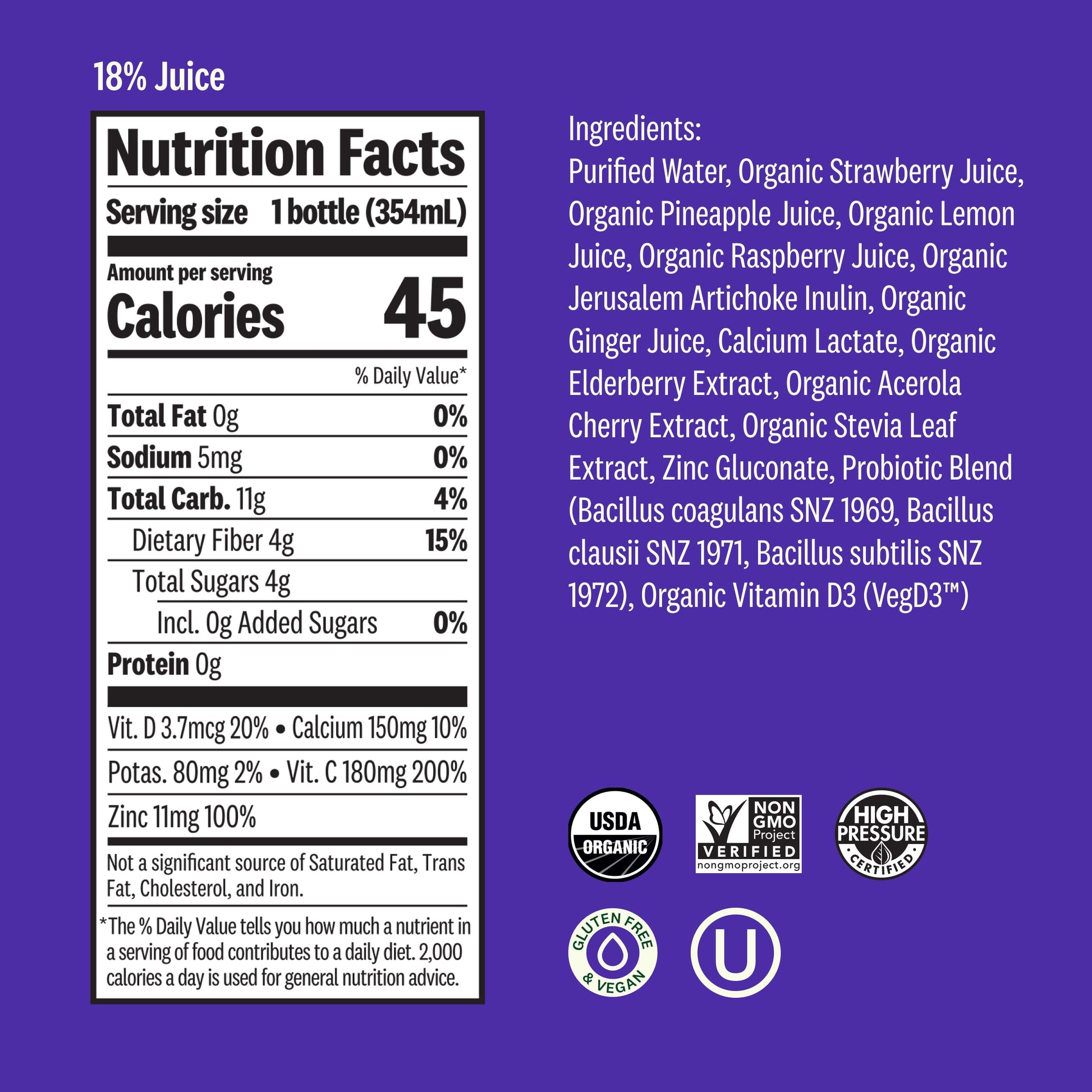All the good stuff your gut needs, in a berrylicious blend. It's not just juice ¡ª it's juice, boosted with probiotics, elderberry, zinc, annatto extract, ginger, reishi & more. And for your palate, we've got organic strawberry, pineapple, raspberry, lemon, apple & acerola cherry. Your gut & your tastebuds will thank you.