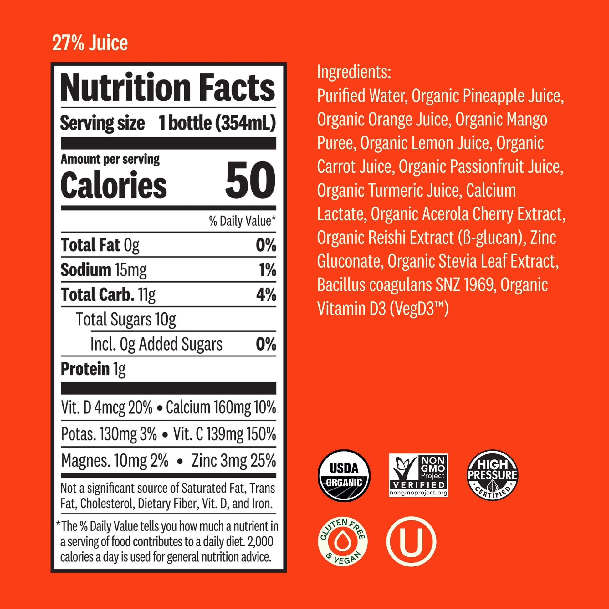 All in on orange for maximum immunity ¡ª it's delightfully sunny. Not just a juice, it's juice¡ª boosted thanks to the superpowers of orange, turmeric, probiotics & reishi. Looks like sunshine, but it packs a punch, keeping you refreshed and revitalized all day.