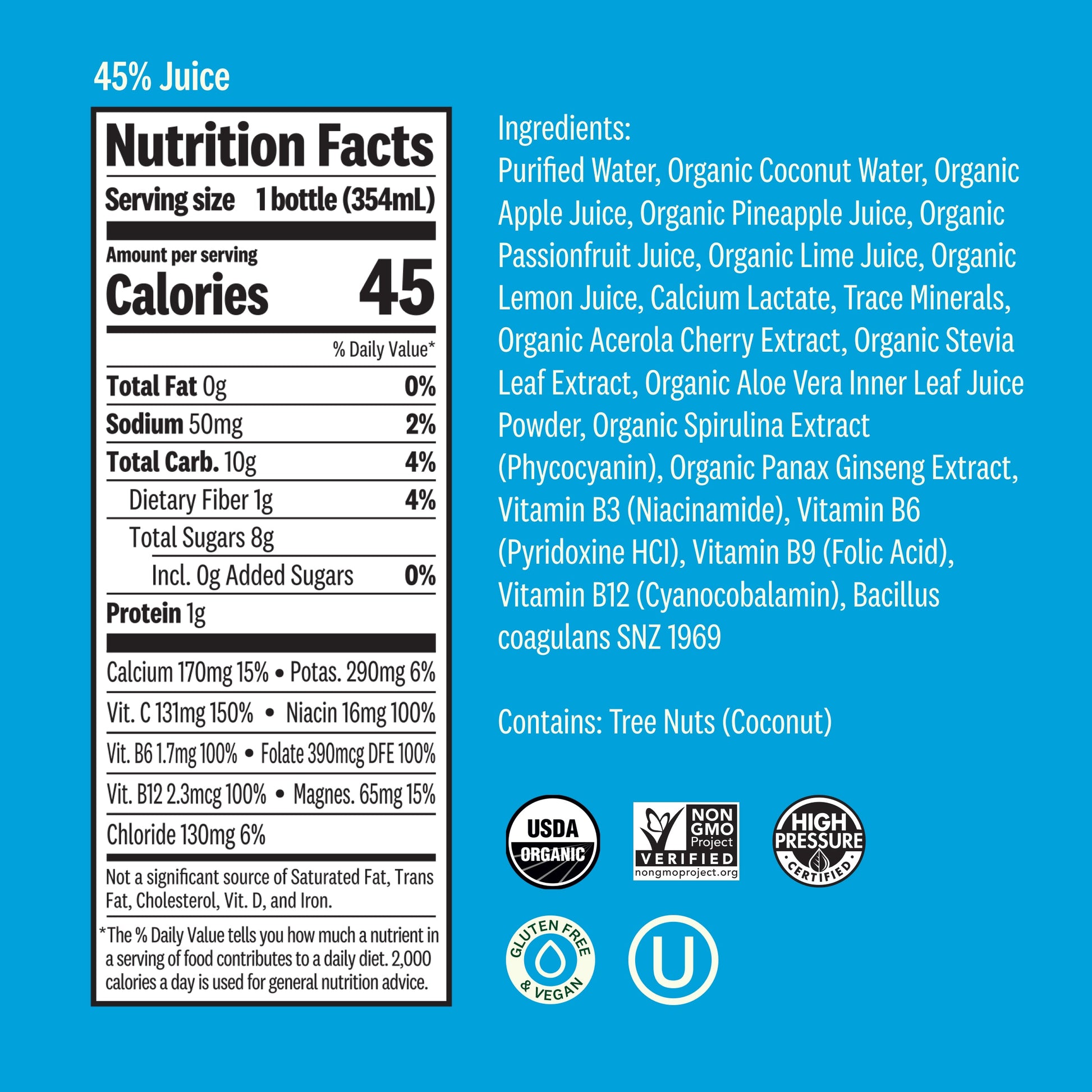 It's not just juice - it's juice boosted with acerola cherry, ginseng, annatto extract, spirulina & more. Hydrating electrolytes & aloe meet their match with the right balance of coconut water, pineapple & passionfruit, making this a revitalizing vacation in a bottle.