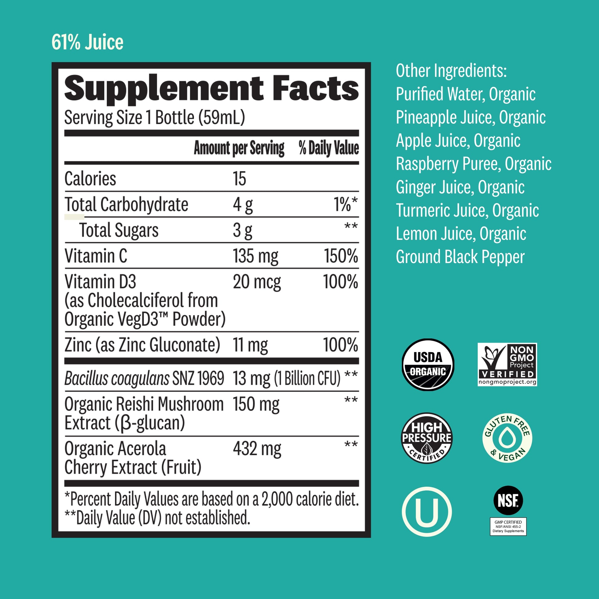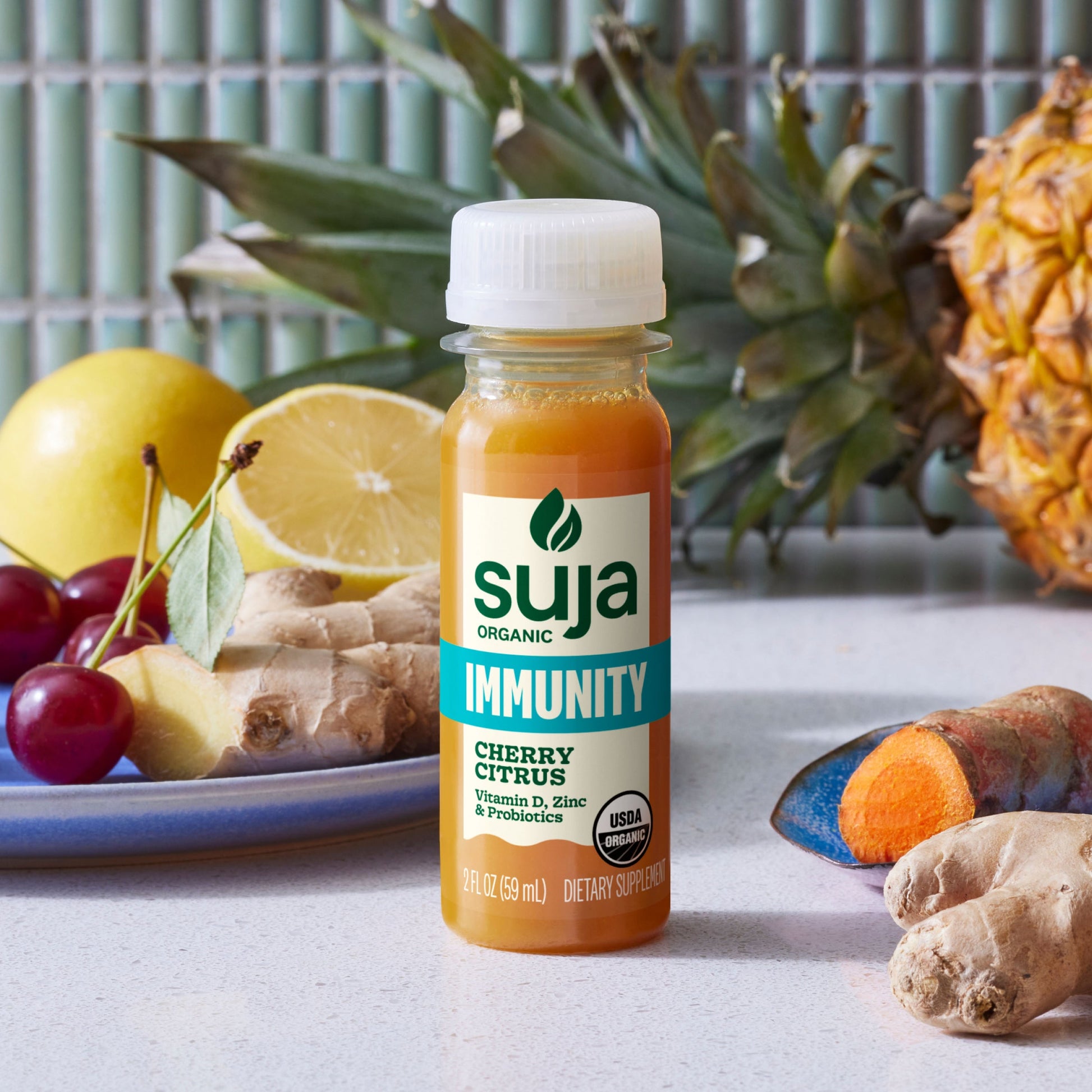 Get big immunity power in a citrus shot ?a it's wellness, maximized. Blending flavor and function, this shot offers a powerful blend of vitamin D, zinc, acerola cherry, reishi and probiotics.?Big benefits. Tiny shot. Super tasty.